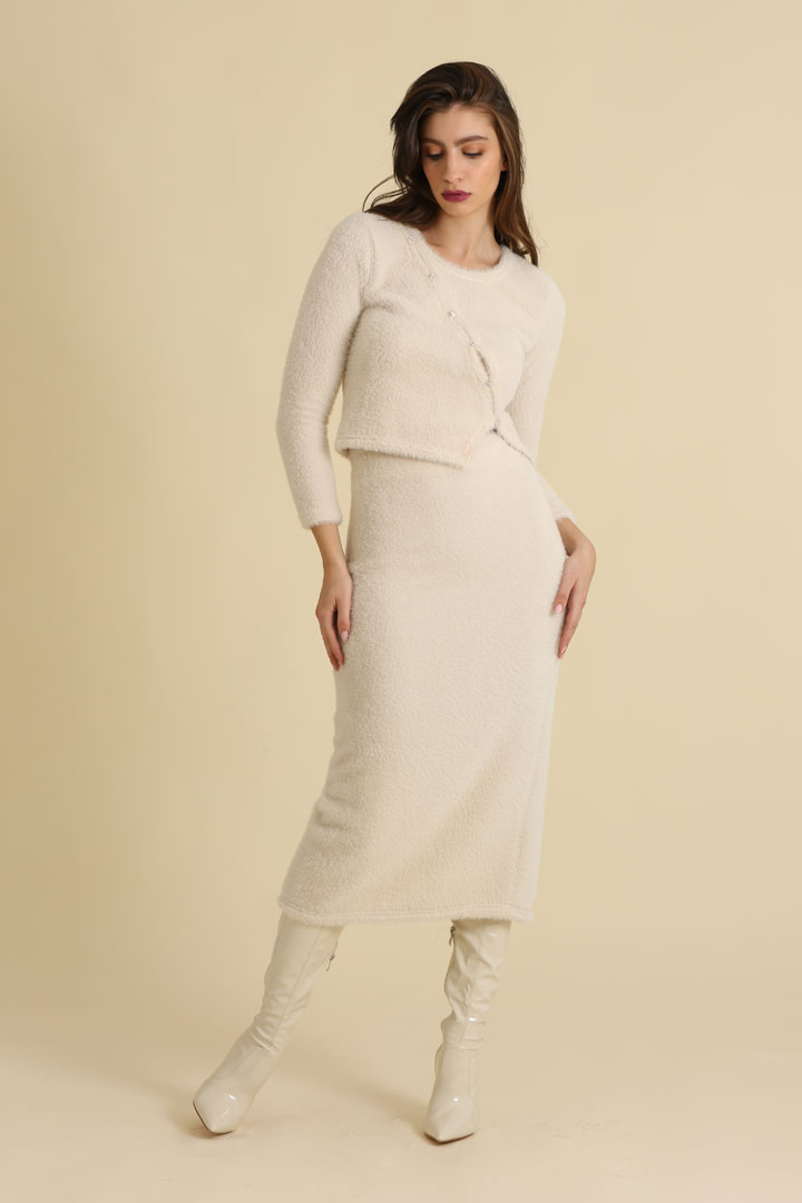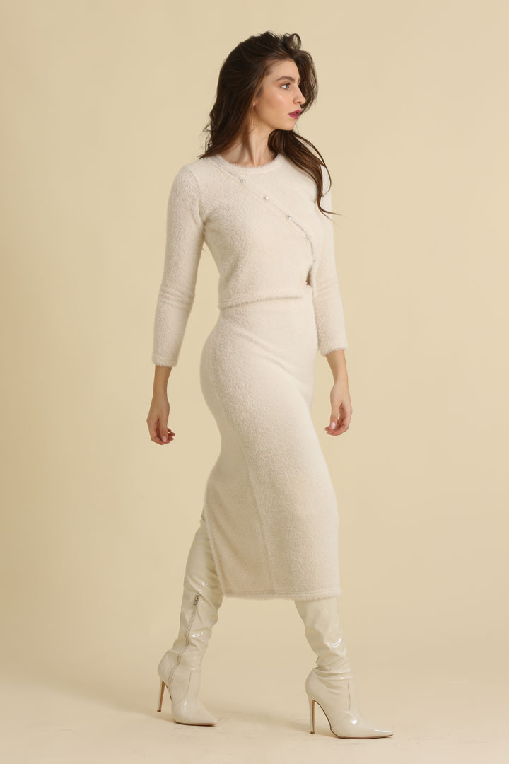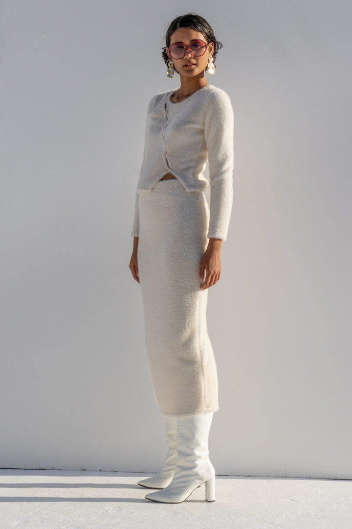 Designed in the perfect furry fabric, Ynez has a body-skimming straight fit silhouette. The slimming fit runs from the high-waist down to the mid-calf and it has a side zipper allows for easy fit. Wear with the Morphe Top for the ultimate Mallory look.