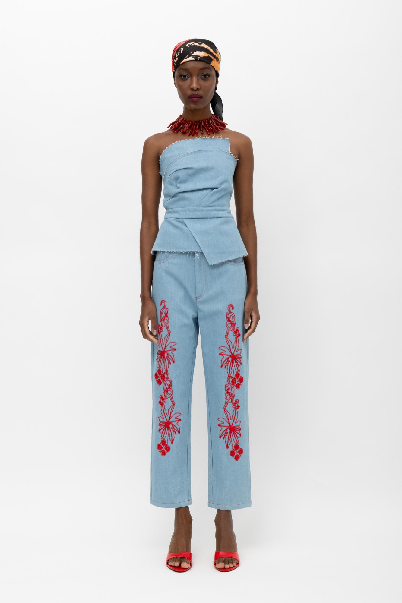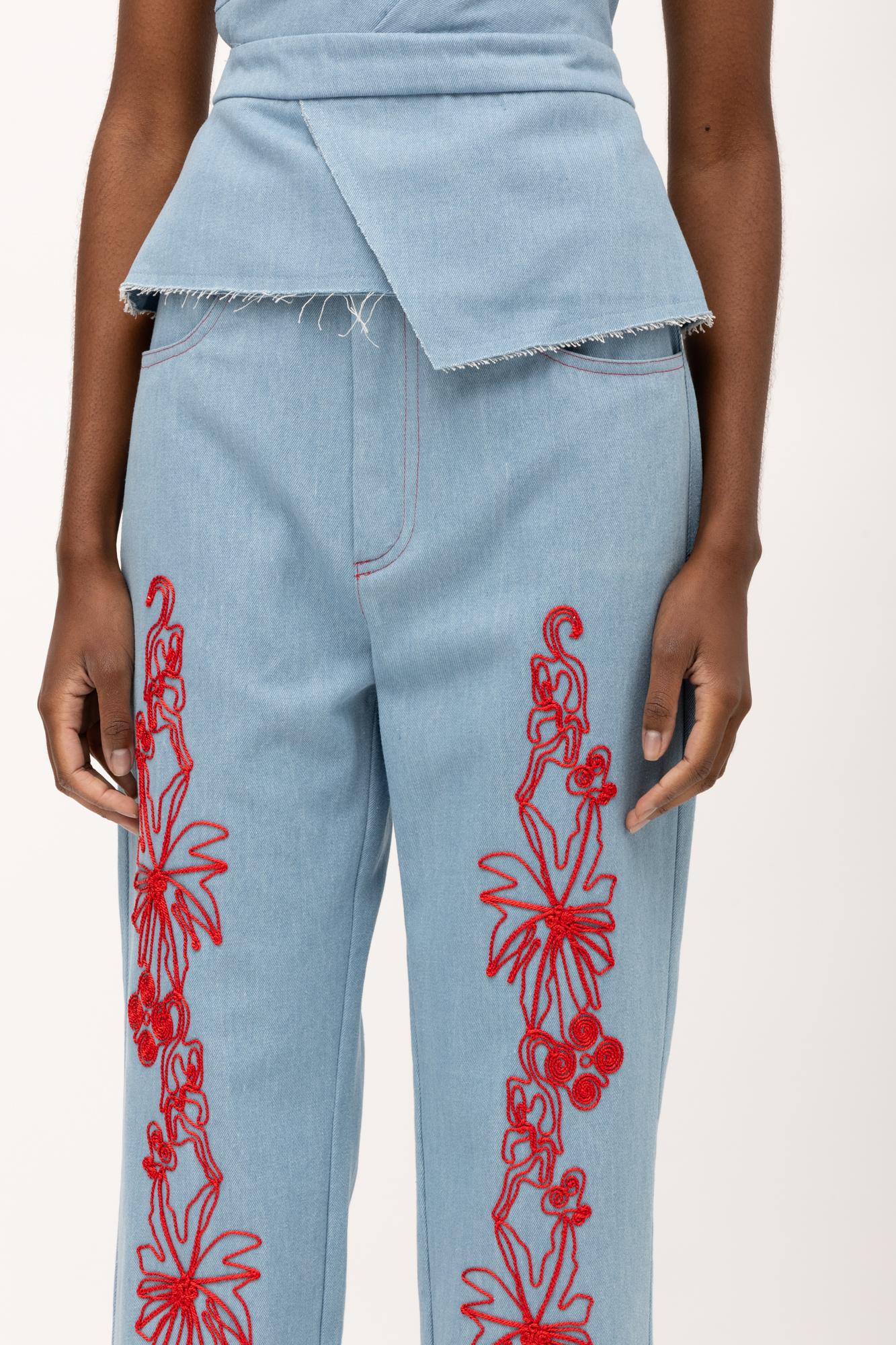 • Jean με κοκκινο κέντημα στο προστινό μέρος